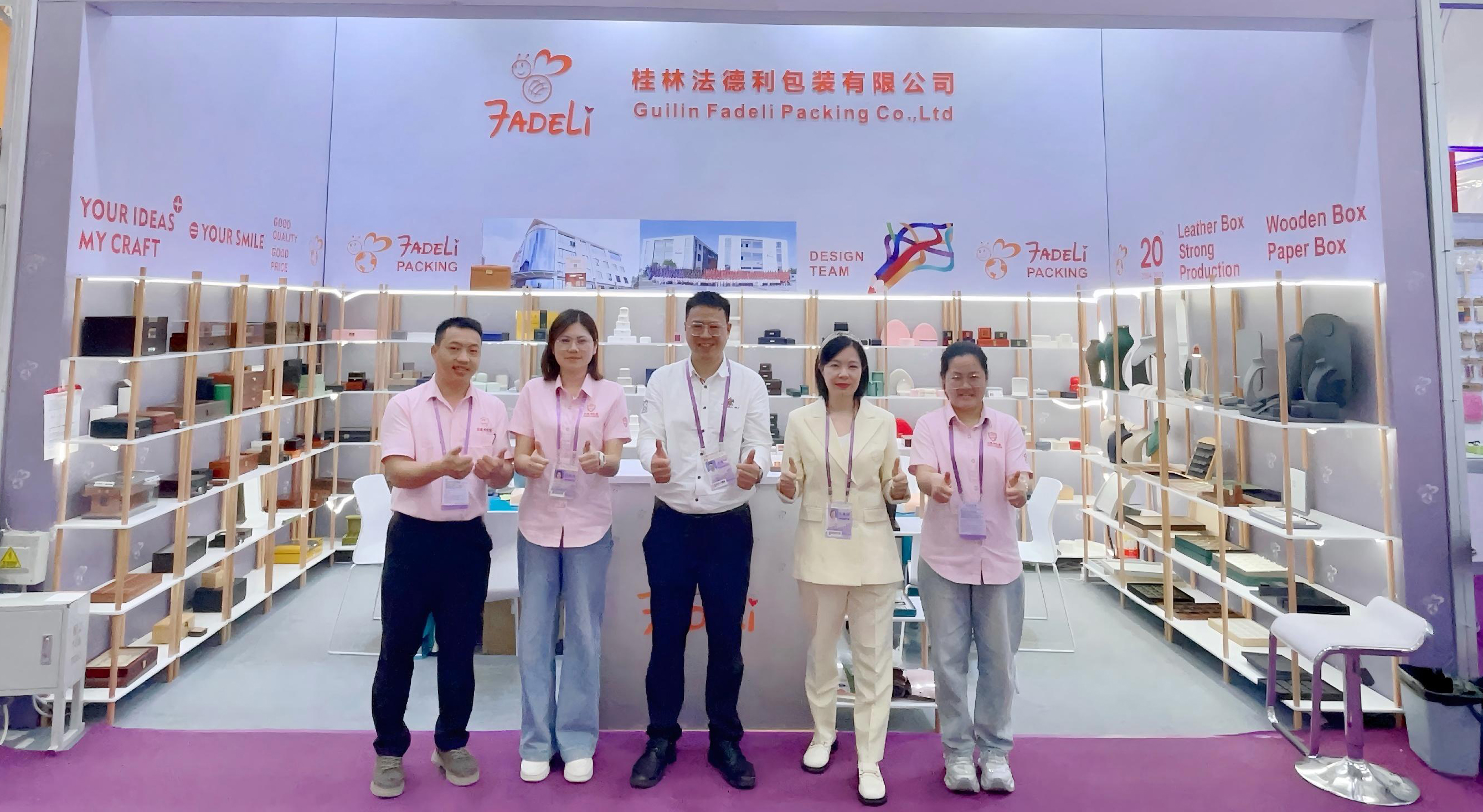 As an exhibitor of this exhibition, Guilin Fadeli Packing Co., Ltd. will also go all out to bring you a unique packaging experience. Our company was established in 2004 and is a comprehensive manufacturing and trading company in China. We have been engaged in the jewelry packaging and gift packaging industry for more than 21 years, specializing in the production of various jewelry boxes, storage boxes, display boxes, gift boxes, leather boxes, wooden boxes, paper boxes, paper bags, etc. Our main products include jewelry storage boxes, necklace boxes, ring boxes, pendant boxes, bracelet boxes, earring boxes, watch display boxes, cosmetic boxes, perfume boxes, etc. At our booth, you will see: