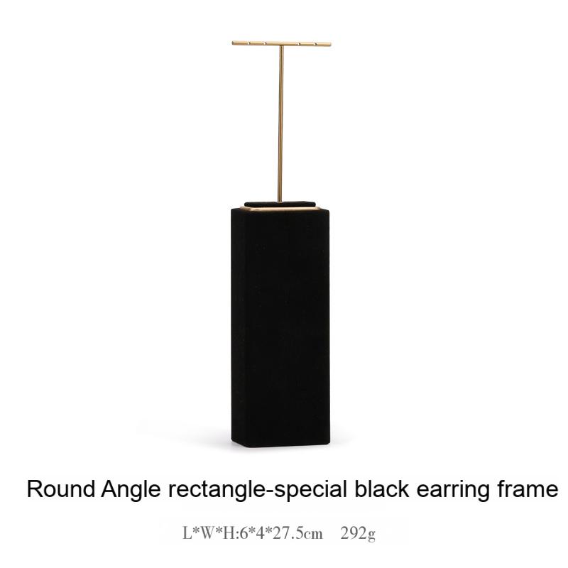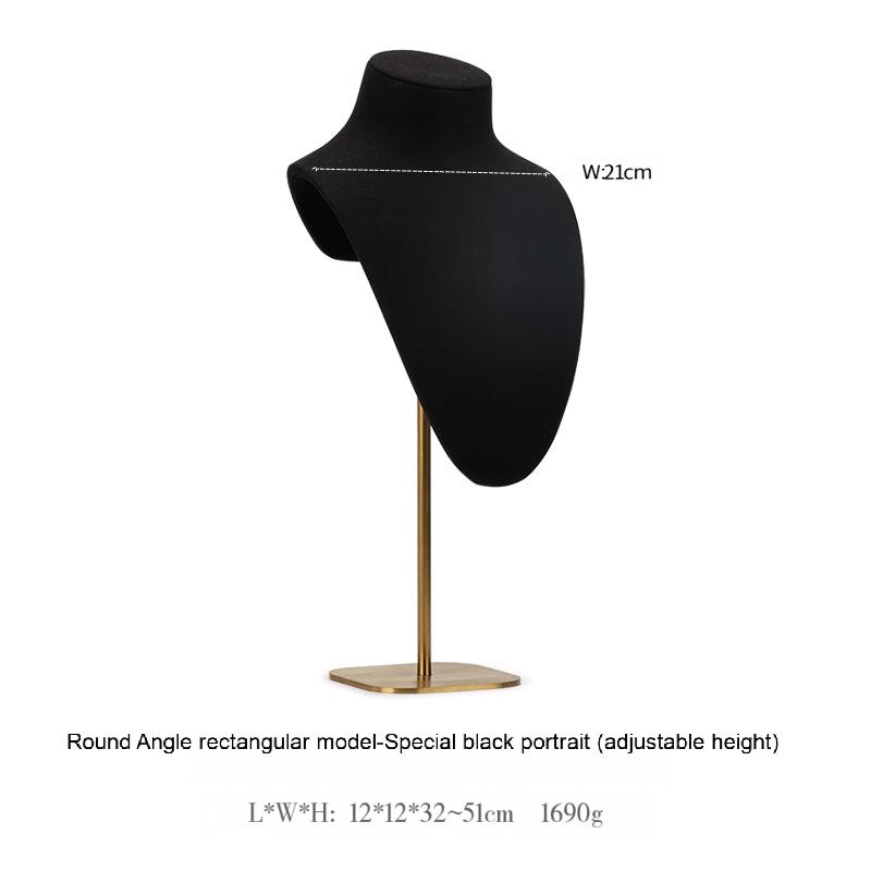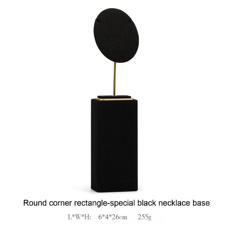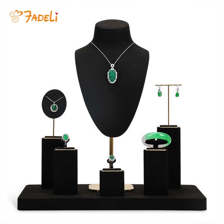 This collection of jewelry display props features human-shaped models and circular/rectangular jewelry racks. Designed in minimalist black tones, these tools showcase necklaces, earrings, and rings on sleek surfaces. Against a clean white backdrop, the exquisite craftsmanship of the jewelry is perfectly accentuated, creating an atmosphere that radiates sophisticated elegance.